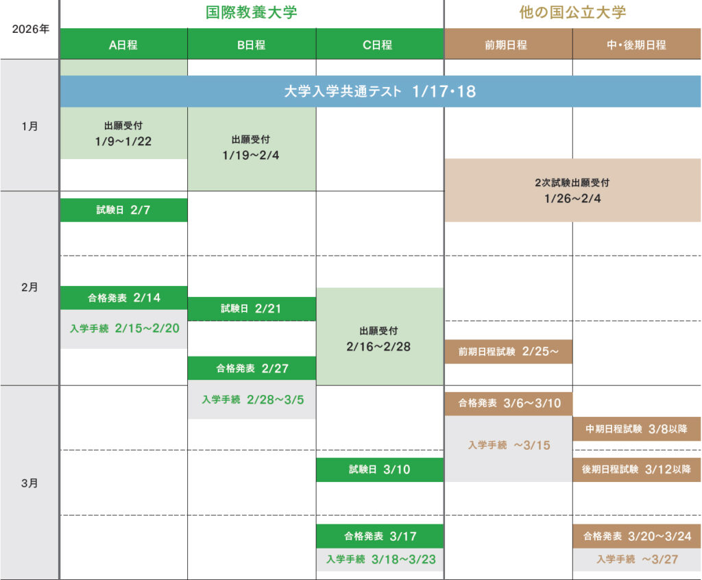 大学入学共通テストの英語・それ以外の2教科の3教科と、国際教養大学が独自に実施する英語・国語の個別学力試験を行います。